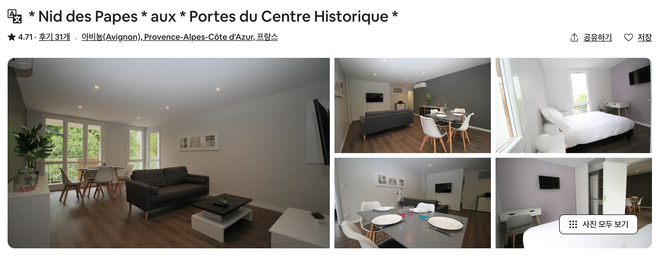 지난 7월 초, 프랑스 남부로 3박 4일 동안의 짧은 여행을 다녀왔다. 여러 도시를 다녔지만 매번 숙소 옮기는 건 번거롭다고 생각했기 때문에 숙소는 아비뇽으로 정하고 렌터카를 이용하여 이곳저곳 다녀왔다. 사실 개인적으로 숙소(특히 잠자는 곳과 화장실)에 엄청 예민한 편이라 도착하기 전까지는 걱정을 많이 했는데, 걱정했던 것과는 달리 꽤나 만족스럽게, 편안히 잘 지내다 와서 후기를 남긴다.
